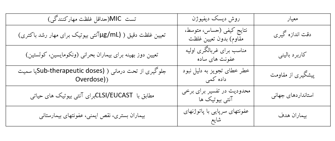 جدول مقایسه ای انجام تعیین جساسیت آنتی بیوتیکی به روش سنتی دیسک دیفیوژن و MIC.